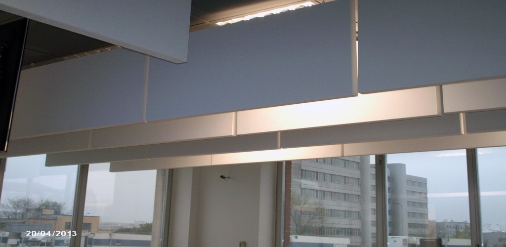 NOIStrap costituita da pannelli di Fibra Poliestere termolegata appesa al soffitto con appositi pendini, che consente di moltiplicare per quattro la superficie fonoassorbente rispetto alla superficie trattata, realizzando un ottimo coefficiente di assorbimento. Le dimensioni standard sono 1200×1200, altezza 200, spessore 40 mm.